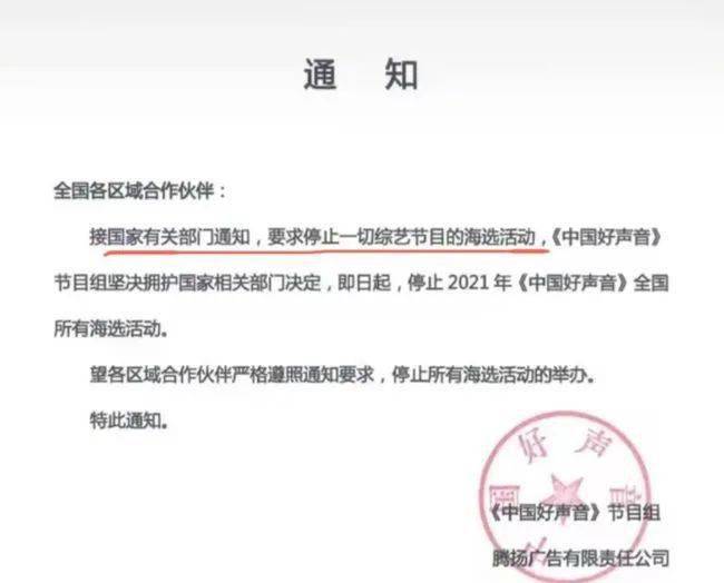 5月24日,一张疑似《中国好声音》节目组在5月20日发出的声明传出,称《中国好声音》从20日开始就要停止2021年全国所有的海选活动,原因是按照国家有关部门通知,要求停止一切综艺节目的海选活动。