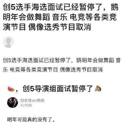 之后,有网友称《创造营5》的选手海选面试也已经停止了,明年会做舞蹈、音乐等各类竞演节目,偶像选秀类节目会取消。