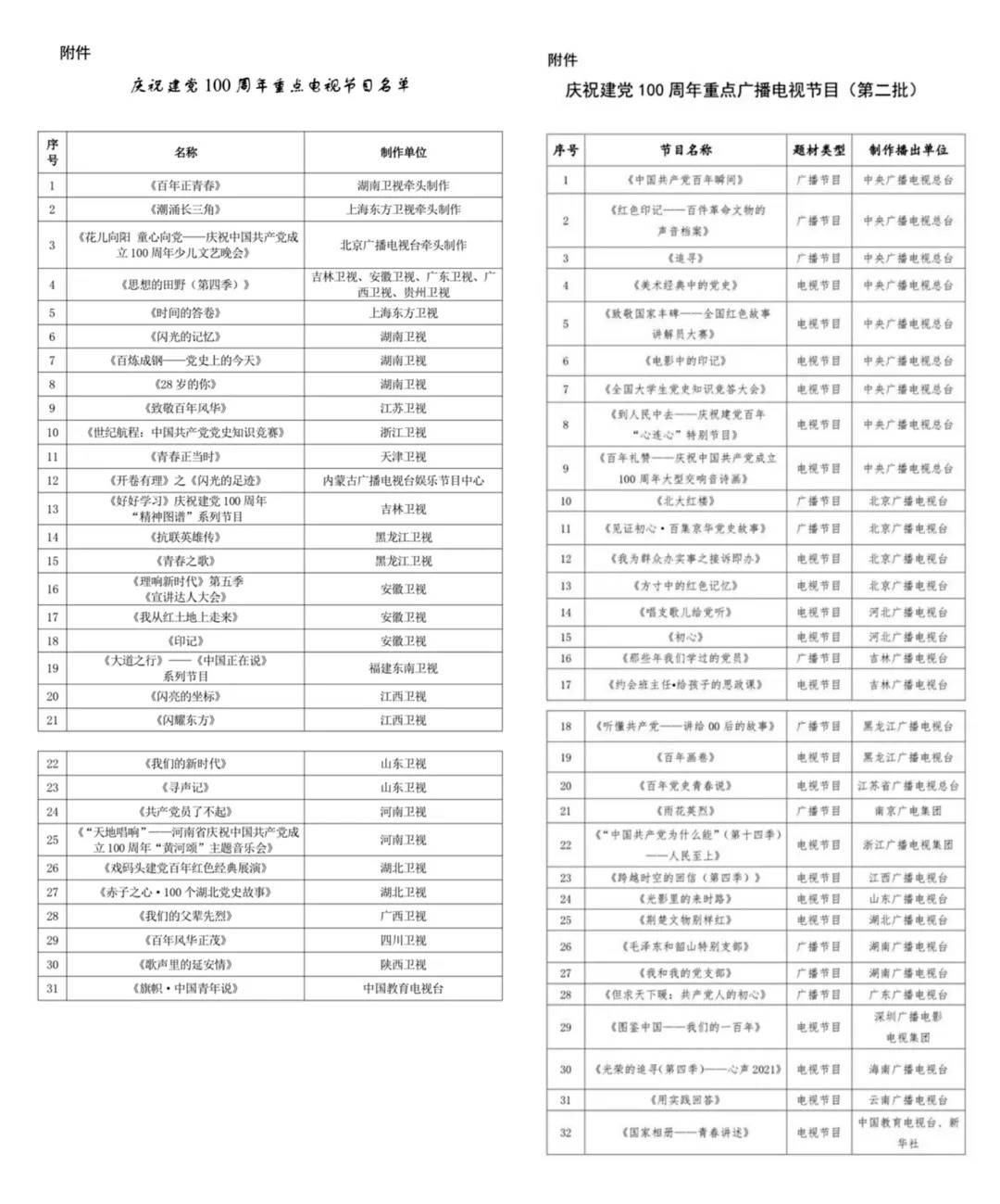 早在今年3月17日,广电总局便发布了《关于做好庆祝建党100周年广播电视节目创作播出工作的通知》,画出了31档重点节目。时隔三个月后,又发布了《庆祝建党100周年重点广播电视节目(第二批)》,共计32档节目入围。