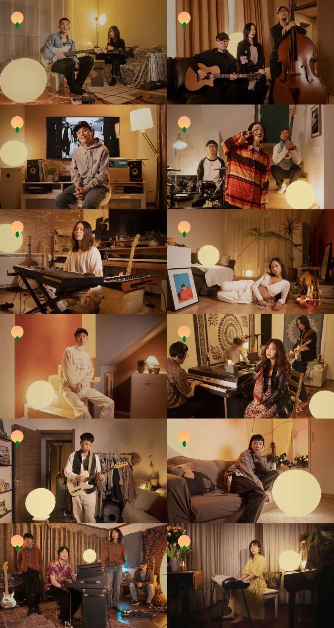 即便偶尔拍摄场地不在音乐人家里,团队也试图保持场景基调的一致。夏之禹的取景在成都明堂唱片老板的家里,陈婧霏则带着乐队来到在制作人家中,布朗尼乐队选择在录音室里取景,画面里都延续了放松、舒适的氛围。视频里特制的暖黄圆形灯成为节目的icon,它象征着太阳,在光合作用下促进音乐人有机生长。