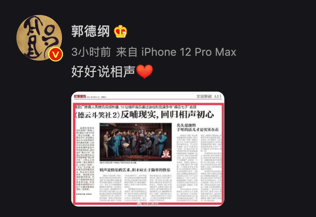 为此,《新京报》还发文赞扬了《德云斗笑社》对现实的反哺,郭德纲也在微博转发,表示要“好好说相声”。
