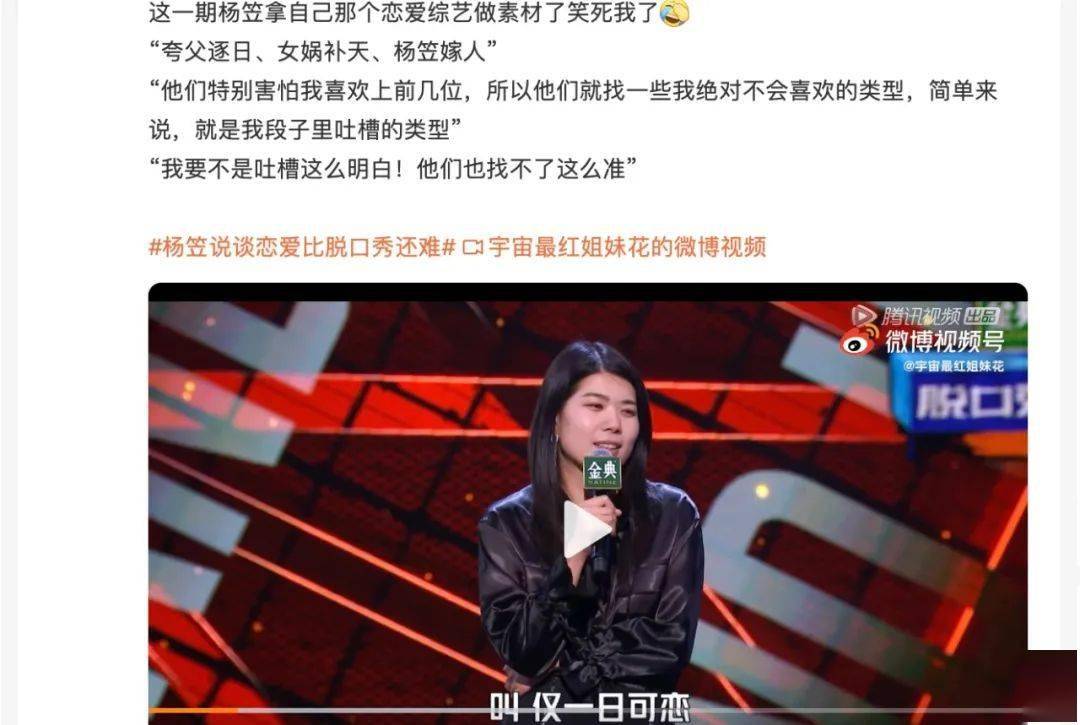 最近有两档微综却带来了惊喜。刚收官的《仅一日可恋》豆瓣评分7.3,微博总阅读量超5亿,拿下 #杨笠 人生不想浪费在不喜欢的人和事上# 、 #杨笠说谈恋爱比脱口秀还难# 等多项微博热搜,这段“相亲奇遇”更被杨笠写进了《脱口秀大会》的段子里。