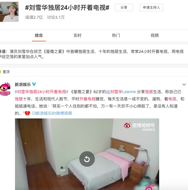 银发时代正在全位面开启,另一面却是快节奏的经济生活里,老年人的情感需求正在被忽视。近日,#刘雪华独居24小时开着电视#登上微博热搜榜,话题阅读量超过2.7亿,这则话题源于B站的一档综艺《屋檐之夏》。刘雪华分享自己的独居生活称:每天生活是一成不变的,遛狗、看电视、和姐姐通电话。