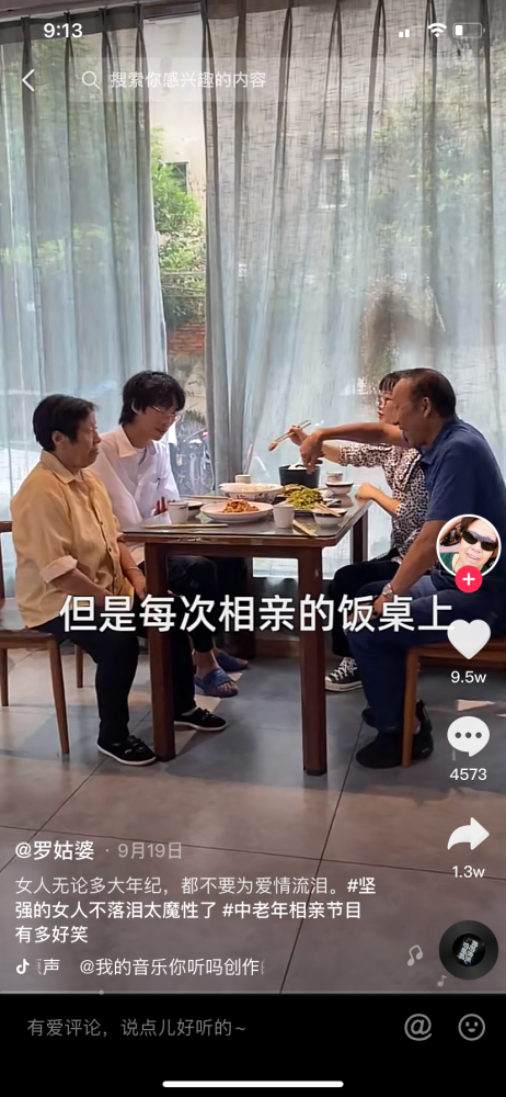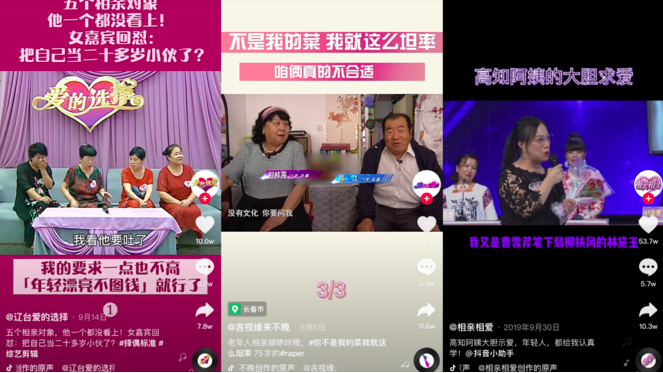 #中老年相亲节目有多好笑#、#中老年硬核相亲#等多个话题,在抖音上的累积播放量迅速破亿。随后,老年相亲节目也快速被挖掘出各种名场面:8月初《缘来不晚》中“你不是我的菜我就这么坦率”的押韵拒绝,2019年《相亲相爱》中高知阿姨“在外穆桂英在老公面前林黛玉”的大胆求爱,也都再次火热出圈。