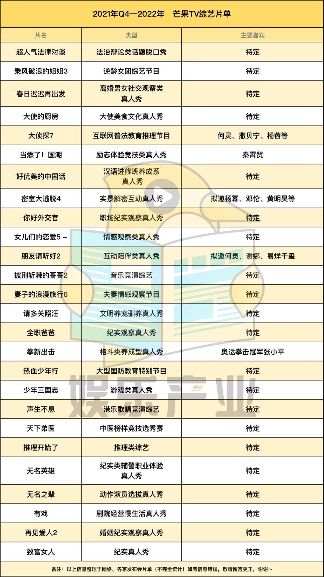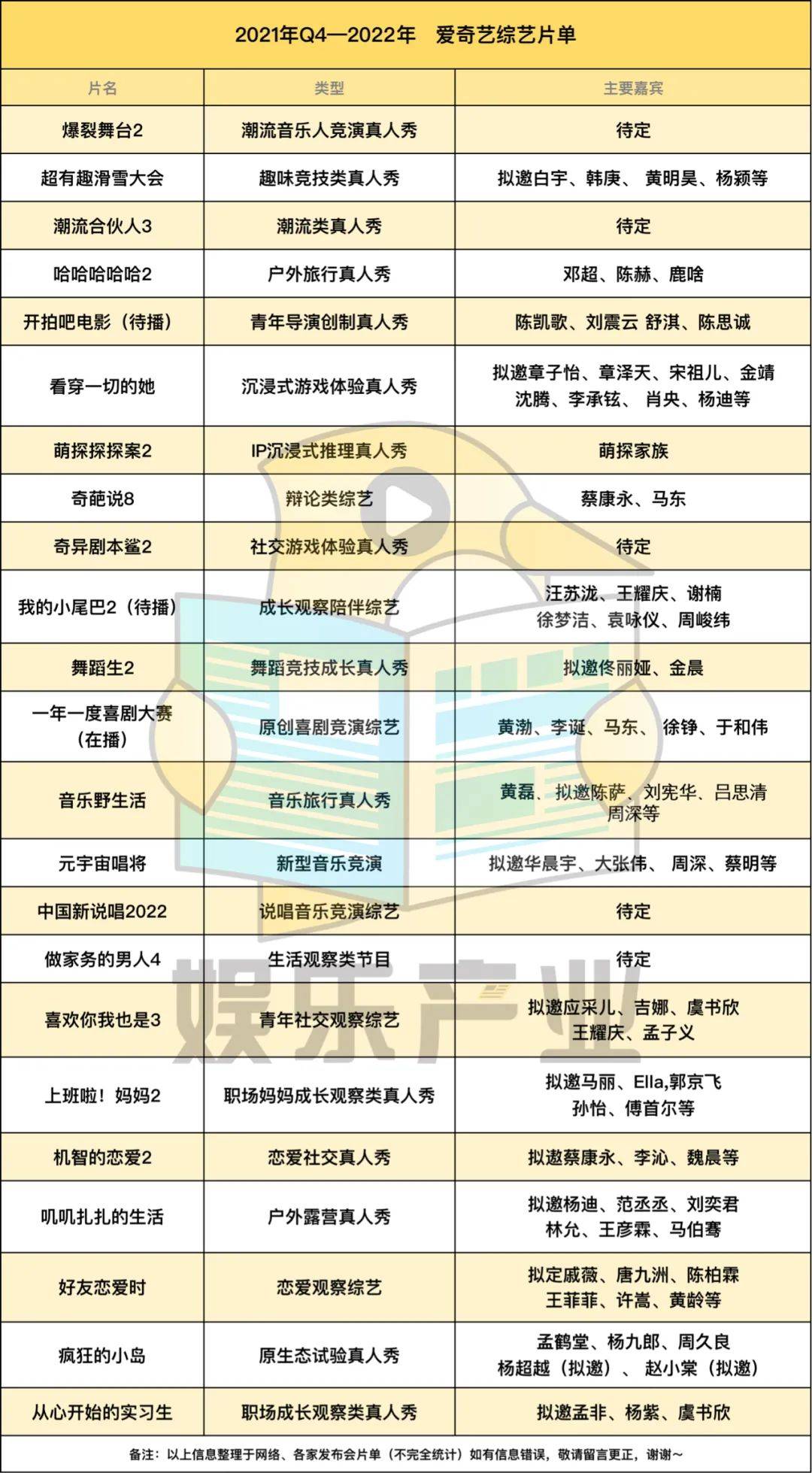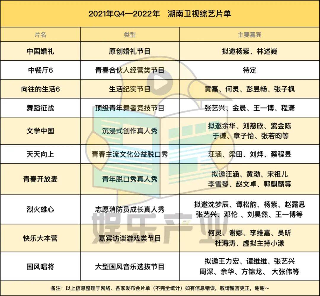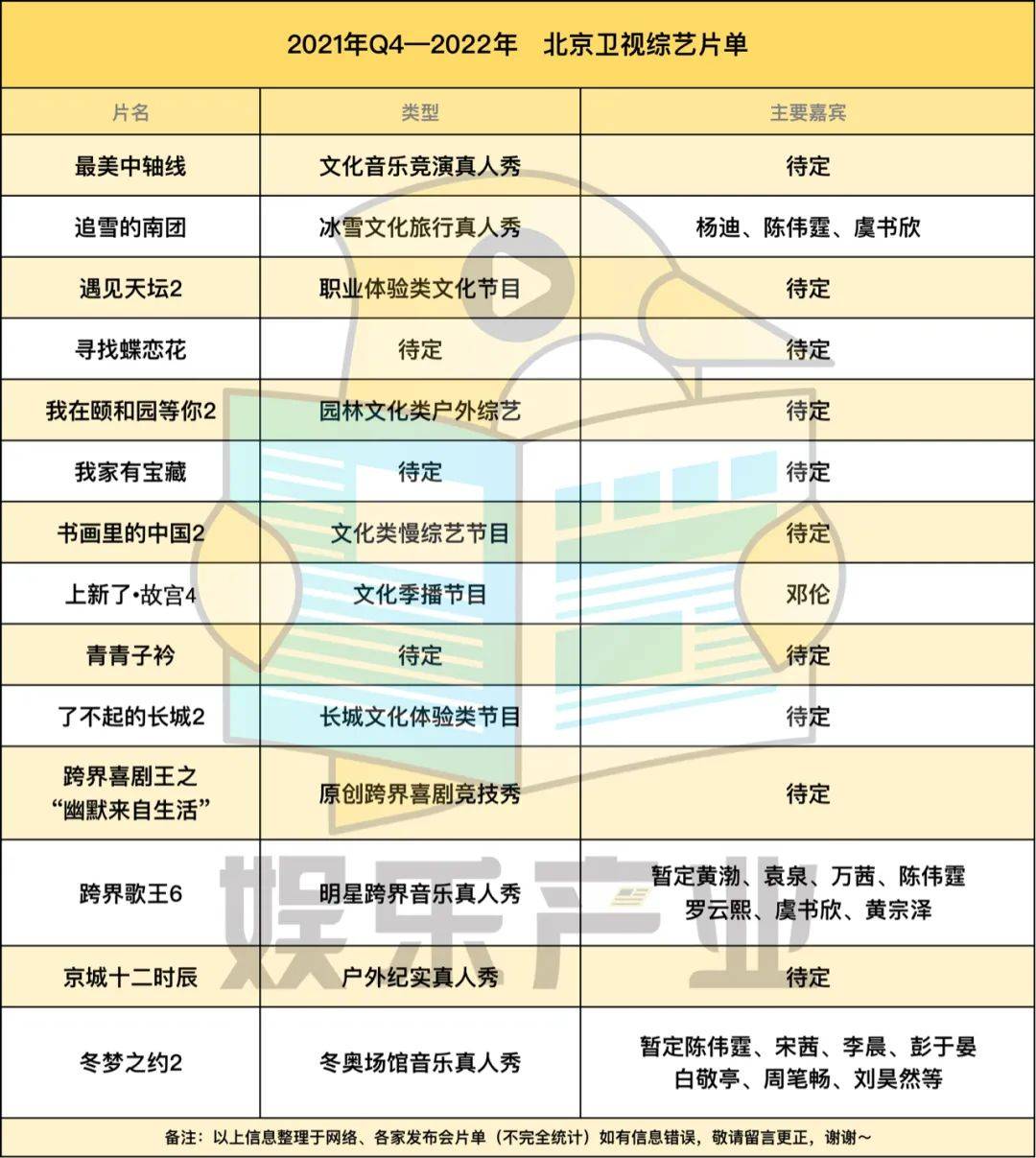 你仔细看,各卫视、平台均有出现在片单中音乐、情感、悬疑推理三大赛道节目,类型上几乎没有鲜明差异,像街舞、侦探、幕后走向幕前的节目,原本近两年只有一家平台在做,但在2022年综艺片单中,出现了新的平台、卫视。另外的共同点在于:这些综艺节目大部分多多少少,都能看到以往综艺模式的影子,阵容(拟邀)亦然,直观感受即综艺嘉宾不够用了。当然,每年都少不了一些凑数或者一看就沦为炮灰的综艺出现在各家招商PPT上,他们甚至都很有可能因为招不了商、码不起人亦或者过不了审,夭折在半路。(具体看表格,直观感受吧,DDDD。)