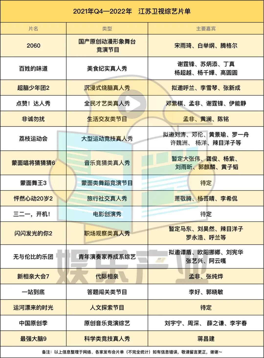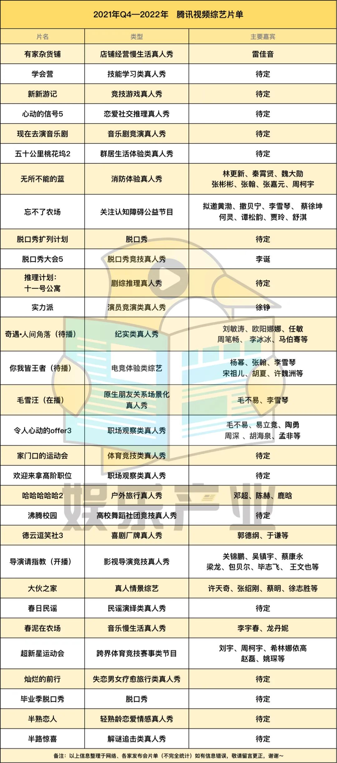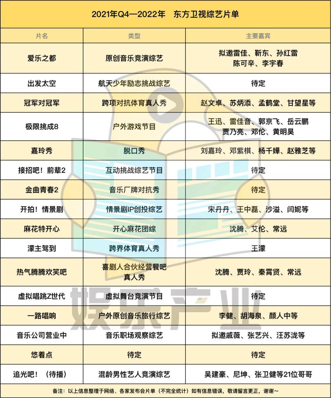 你仔细看,各卫视、平台均有出现在片单中音乐、情感、悬疑推理三大赛道节目,类型上几乎没有鲜明差异,像街舞、侦探、幕后走向幕前的节目,原本近两年只有一家平台在做,但在2022年综艺片单中,出现了新的平台、卫视。另外的共同点在于:这些综艺节目大部分多多少少,都能看到以往综艺模式的影子,阵容(拟邀)亦然,直观感受即综艺嘉宾不够用了。当然,每年都少不了一些凑数或者一看就沦为炮灰的综艺出现在各家招商PPT上,他们甚至都很有可能因为招不了商、码不起人亦或者过不了审,夭折在半路。(具体看表格,直观感受吧,DDDD。)