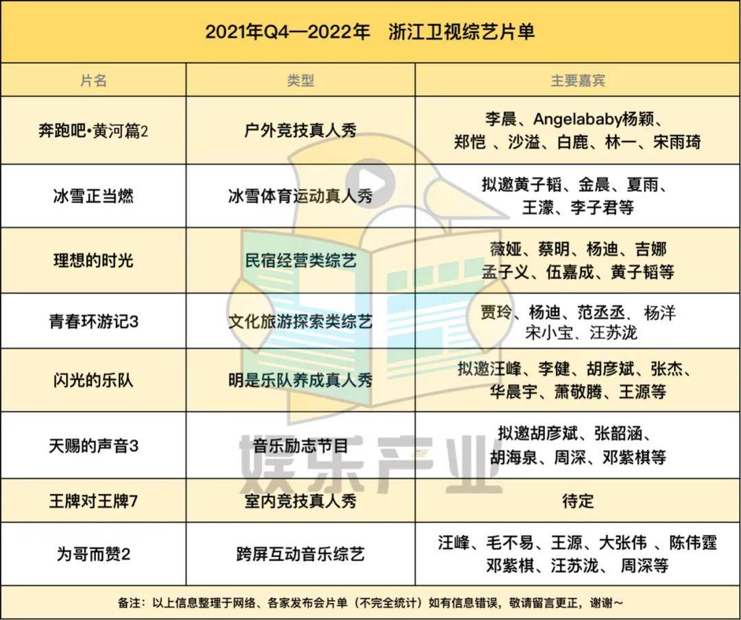 浙江卫视依然是综N代占据主导。《奔跑吧·黄河篇2》在播中,《王牌对王牌7》《青春环游记3》《天赐的声音3》《为歌而赞2》名列前茅;新综三档:《冰雪正当燃》像是命题节目,懂的都懂,《闪光的乐队》《理想的时光》,明星乐队养成真人秀和民宿经营类综艺,题材不新,拟邀和已邀请嘉宾阵容也都是些综艺常客。总结而言,新老综艺都延续浙卫的综艺作风,码一个全明星阵容的盘子,怎么着都能招到商开播。