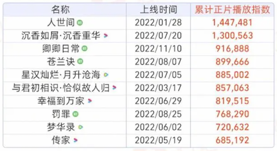 腾讯视频今年的表现不尽如人意,也与备受诟病的排播策略有关。多部重点作品排播延后,排播档期随意插播,为了招商拉长播出战线,严重干扰了观众的追剧节奏,也一步步耗尽了观众的耐心。不过,从2023年的片单来看,腾讯视频的内容多元化程度相比今年有了很大的提升,“剧场化”策略也终于姗姗来迟,有望部分收复今年的失地。