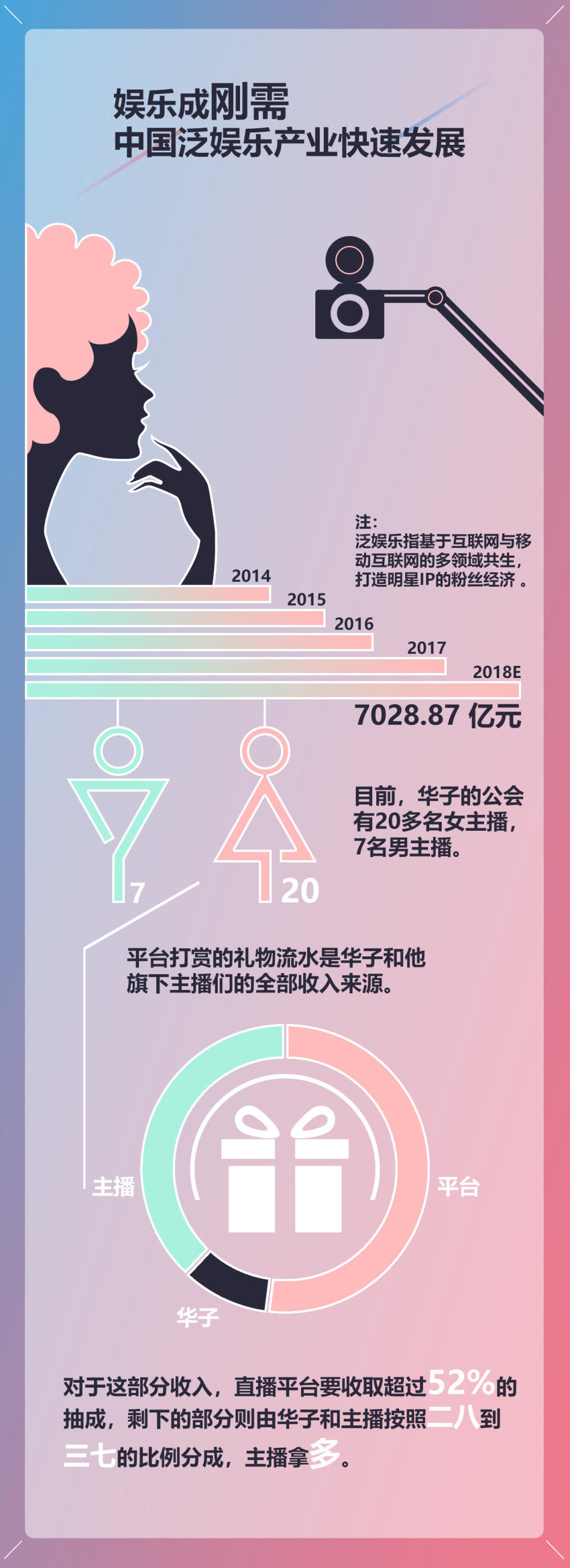 作为公会老板的华子,实际上是直播行业最基层的管理人员。一方面,他需要向平台缴纳礼物分成;另一方面,他也要给旗下的主播发工资,以及根据市场情况决定最好的直播策略。