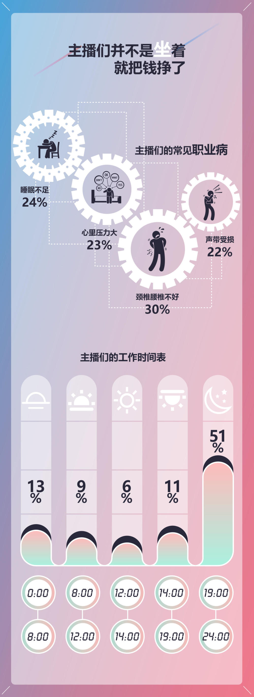 晚上八点到凌晨四点是直播间观众最多的时候。为了获得更多的礼物流水,华子过上了昼伏夜出的生活。“我一般每天凌晨六点入睡,下午两三点起床。下午五六点钟吃一顿饭,然后主播们就要开始直播了,作为管理人员,我要等所有主播全部下播后,才能睡觉。”