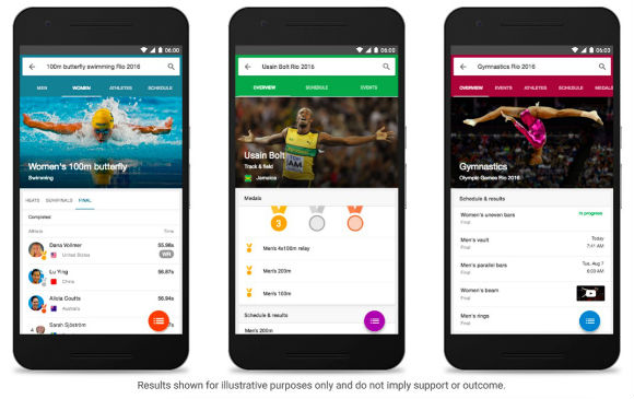 首先,Google 搜索引擎针对里约奥运会进行了专门优化,只要在搜索框中输入相关联的关键词,就能够对奥运会的状况清晰一览。另外,在 Android 和 iOS 的 Google app 中搜索,能看到一些重磅项目的实时更新。