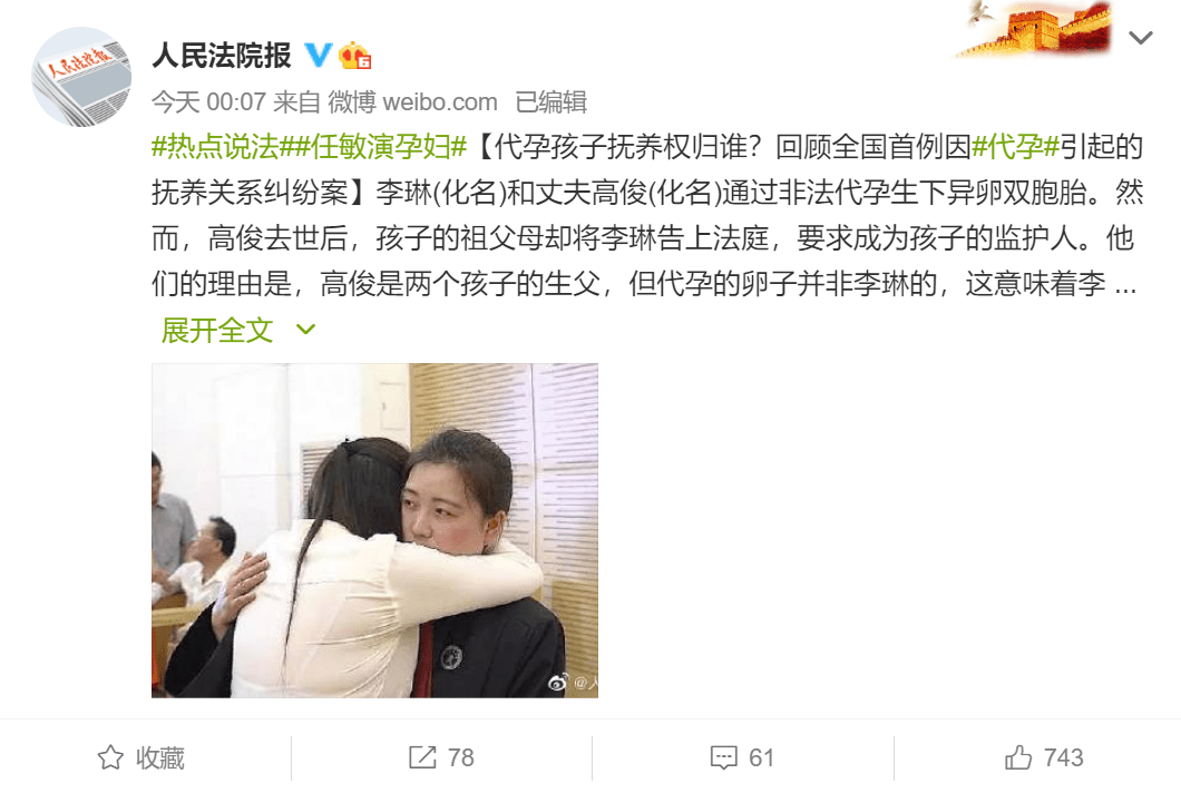 人民法院报还发文回顾了全国首例因代孕引起的抚养关系纠纷案。
