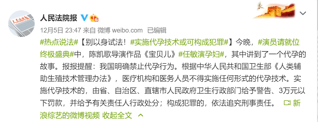 《宝贝儿》讲述了一个虚构的代孕故事,被@人民法院报点名: “别以身试法!实施代孕技术或可构成犯罪”。