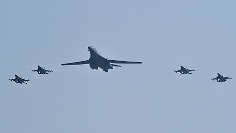 韩联社报道说,其中一架B-1B在韩国空军四架F-15K战斗机护航下飞越驻乌山空军基地上空,另一架B-1B在美国空军四架F-16战斗机护航下紧随其后。乌山空军基地距朝韩边境非军事区约77公里。