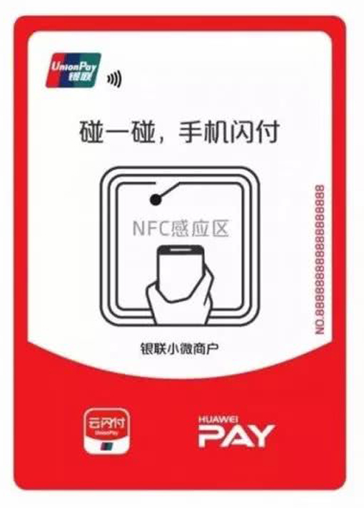 Huawei Pay与银联的 “碰一碰”支付商家开通方式,仅需开通在线手机收单服务。根据视频演示理解,将带有“NFC”闪付标签贴在收银柜台上即可,完全不需要相关的POS以及扫码设备,这样可为商家免去了硬件以及工本费。