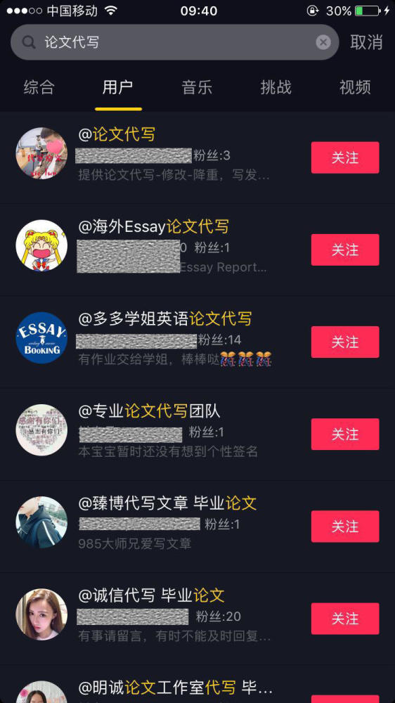 南都记者在淘宝、百度贴吧搜索“论文代写”均未找到相应信息,而在QQ上也未能发现类似的讨论群。然而,在一些新型平台如短视频平台上,通过搜索“论文代写”,却能发现多个名称中含“论文代写”的用户。这些短视频平台用户要么没有发布任何短视频,要么发布的内容为拍摄写好的论文页面。