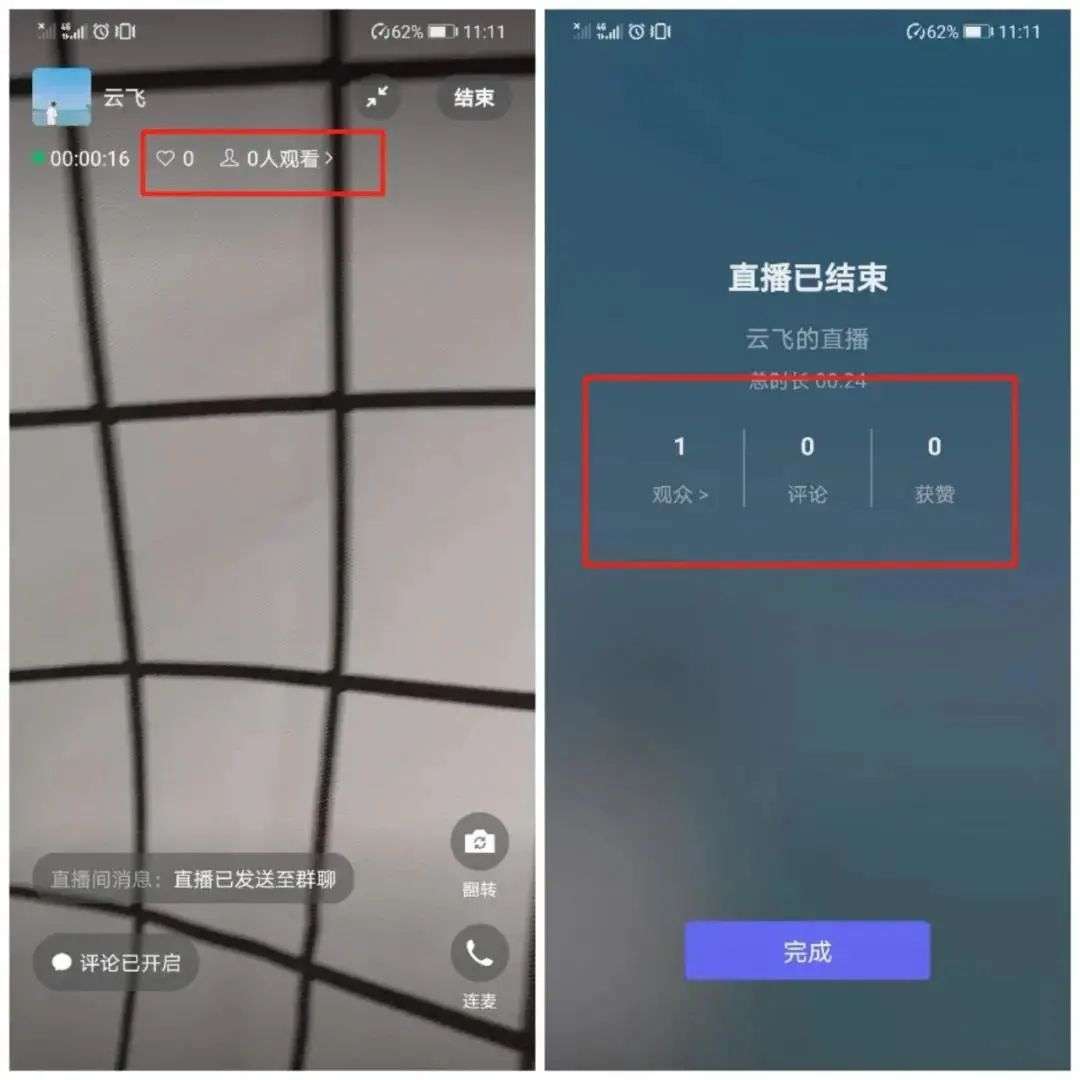 4、直播后主播页面会显示收看直播的观众数,收到的评论和点赞数,目前用户侧不支持观看直播回放,主播直播时也没有任何美颜、购物车、设置封面等高阶功能。