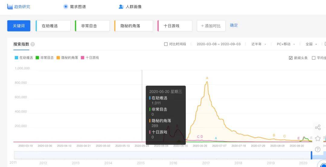 “迷雾剧场”正式上线前,《在劫难逃》的观众期待值比《非常目击》《十日游戏》甚至《隐秘的角落》都要高,这一点对比四部剧近半年的百度指数就能清楚看到。至于主要贡献者,无疑是身为二番男主演的鹿晗。