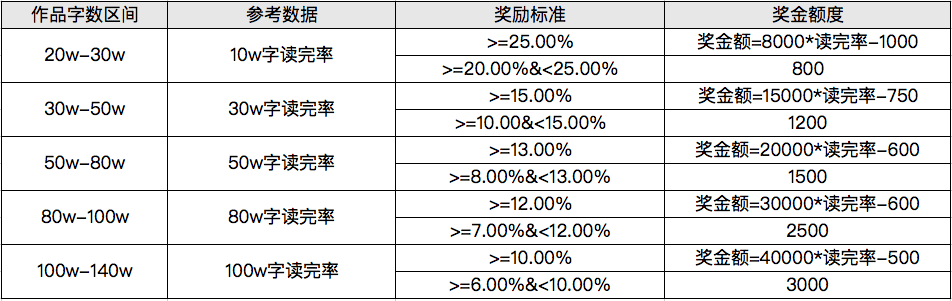 星火计划将根据读完率(N 万字读完率 = 从第 1 章开始阅读了 N 万字的用户数 / 累计用户数)每月评选一次获奖作品(名额不限),并根据作品不同字数区间内的读完率高低发放不同额度的补贴。读完率越高,现金补贴越多。
