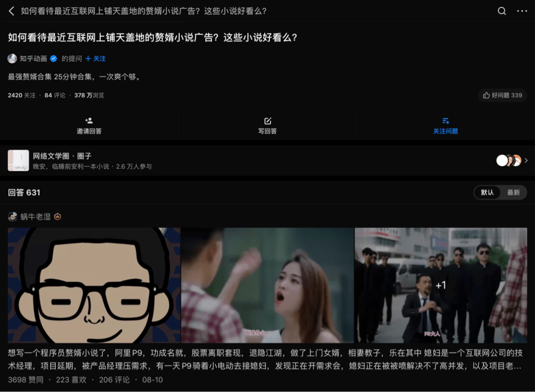 在知乎,仅「如何看待最近互联网上铺天盖地的赘婿小说广告?这些小说好看么?」一个问题就达到了2420个关注,378万的浏览,631个回答。