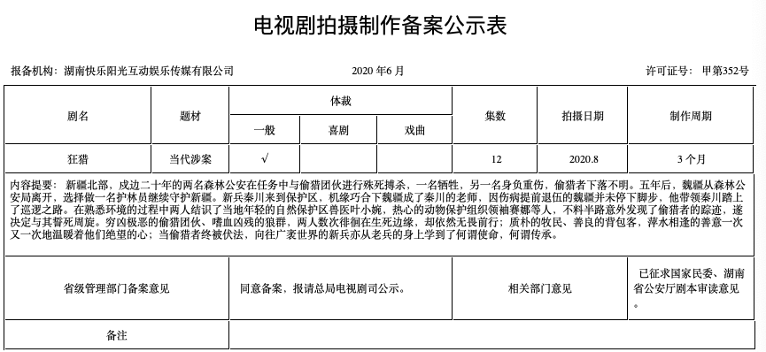 《狂猎》于今年6月备案,主打“当代涉案”题材。据悉,故事讲述的是新疆北部,戍边二十年的两名森林公安在任务中与偷猎团伙殊死搏杀,一名牺牲、一名身负重伤五年后的故事。