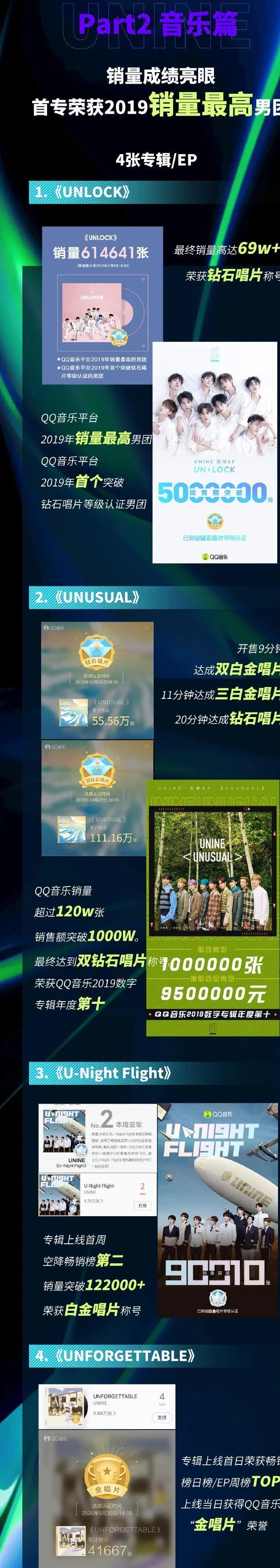 截图自UNINE官博在该团解散时发布的UNINE成绩单:四张唱片销量从钻石唱片到金唱片