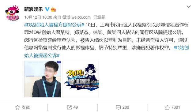 10月12日,据公开媒体消息,上海市闵行区人民检察院以涉嫌侵犯著作权罪对嘀哩嘀哩创始人温博特等4人提起公诉。