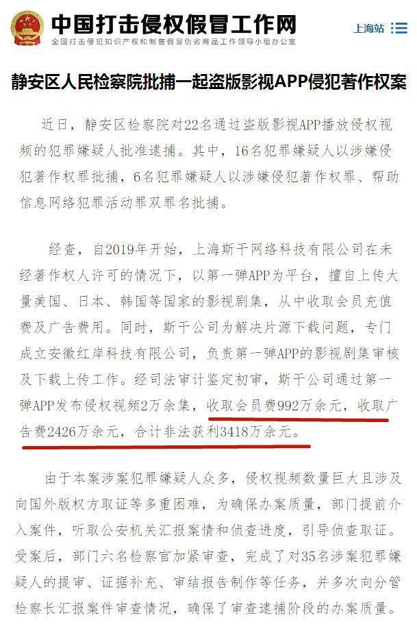 8月12日,中国打击侵权假冒工作网消息,二次元社区平台第一弹擅自上传大量海外影视剧资源,从中收取会员充值费及广告费用,合计非法获利3418万,平台相关负责人被依法批捕。