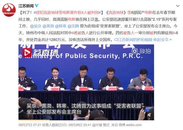 9月25日,扬州市终极人民法院信息,侵害《流浪地球》等电影著作权4人在2016年6月——2019年春节期间,累计复制发行盗版影片 400 余部,非法经营数额 777 万余元,4人被判有期徒刑4——6年不等,并处罚金1280万。