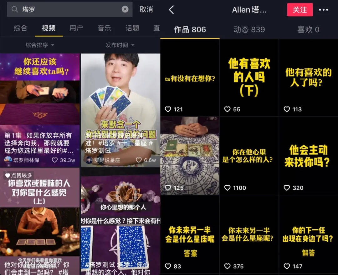 随着深入了解,在各个平台上,塔罗占卜在短视频领域的活跃度明显更高。