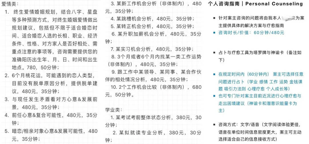 通过参考几位头部塔罗UP主的预约报价,每小时基本集中在400-800元之间。某些塔罗UP主更会将占卜问题逐项分类,甚至细致到“转正机会分析”、“拟就读专业分析”等等,不同问题价位不一。