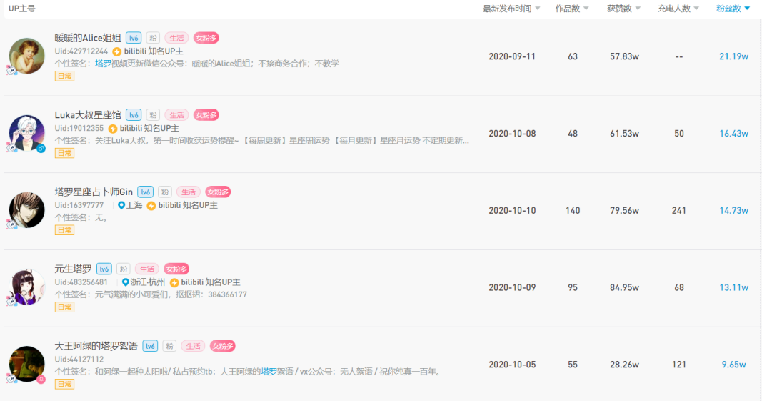 以“塔罗”为搜索关键词的粉丝数TOP5 UP主(数据来源:新站)