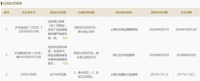 处罚信息显示,该行政处罚决定书文号: 沪市监总处〔2020〕322020000119,作出行政处罚决定日期: 2020年09月27日。