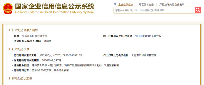 国家企业信用信息公示系统近日发布的处罚信息显示,光明乳业股份有限公司因违反第九条第(四)项规定,发布广告损害国家的尊严或者利益,泄露国家秘密;被上海市市场监督管理局作出罚款30.0000万元,责令停止发布的行政处罚。