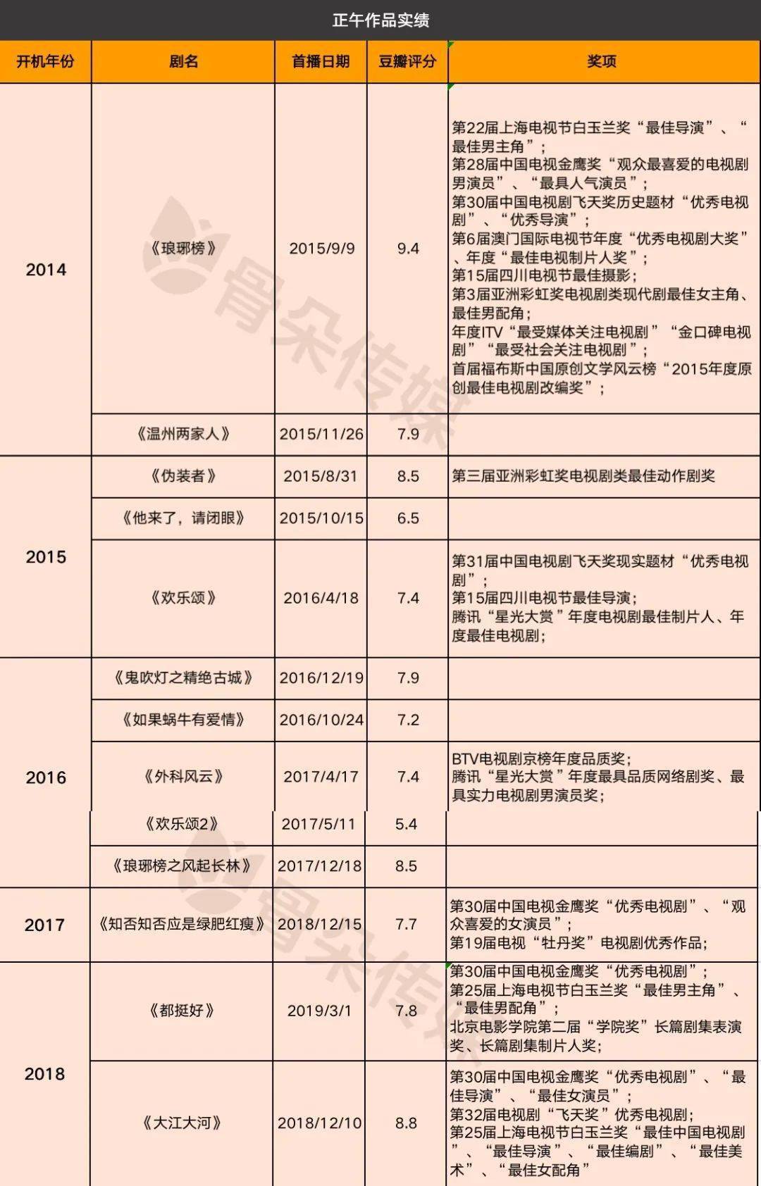 据不完全统计,正午成立9年,出品的电视剧共斩获飞天奖、白玉兰奖、金鹰奖在内的“中国电视剧三大奖”共21项, 还未涵盖侯孔这对“黄金搭档”山影时期联手打造的《闯关东》《父母爱情》《老农民》《北平无战事》《战长沙》等佳剧;每年至少会出一部豆瓣高分国产剧TOP10,《琅琊榜》《大江大河》分别获得播出年度豆瓣评分最高国产剧,其中《琅琊榜》凭9.4分创下的国产IP剧最高分纪录至今未破;它捧红了胡歌、靳东、王凯“明家三兄弟”,也助力王庆祥、孙阳、刘钧、刘奕君、刘琳等戏骨破圈,新生代乔欣等一“剧”成名。