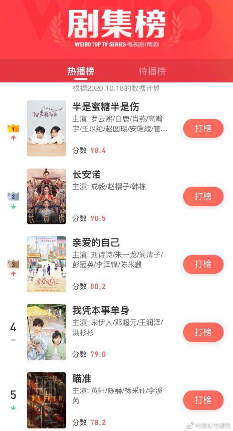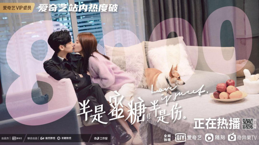 《半是蜜糖半是伤》开播以来,爱奇艺剧集热度值突破8000,上线首日猫眼热度值高达9298,除了热度值名列前茅,还连续两周拿到6个猫眼剧集全网热度冠军,微博同名相关话题已接近百亿阅读量,上映4周拿到微博电视剧排行榜两个周冠军,在抖音剧集排行榜位列周榜第二,热度高达733.1万,相关信息播放达96.6亿次,豆瓣评分7.7,是一部实实在在的“出圈”甜宠剧。