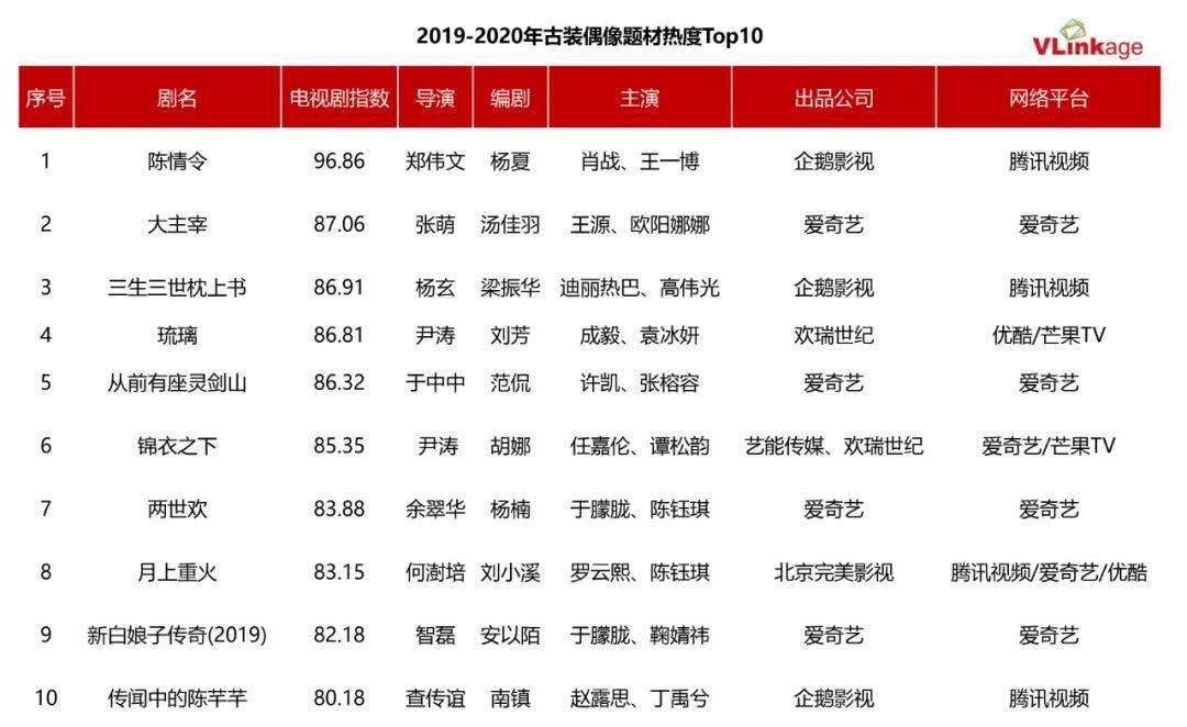 伴随偶像剧数量井喷,两者也实现了“提质扩容”。在观众日渐提高的审美水平背后,关于两者的话题讨论频次也越来越高。接下来,我们盘点了2019-2020年古偶、现偶热度TOP10作品,通过对比电视剧指数、豆瓣评分、主创团队、出品公司、播出平台等参数,探讨它们各自的吸引力、造星力以及侧重点,发挥比较优势,补足短板。