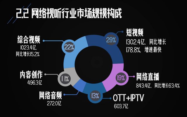 根据《2020中国网络视听发展研究报告》,截至2020年6月,我国网络视听用户规模达9.01亿,其中短视频用户规模8.18亿,综合视频用户规模7.24亿;在网络视听产业中,短视频的市场规模占比最高,达1302.4亿。