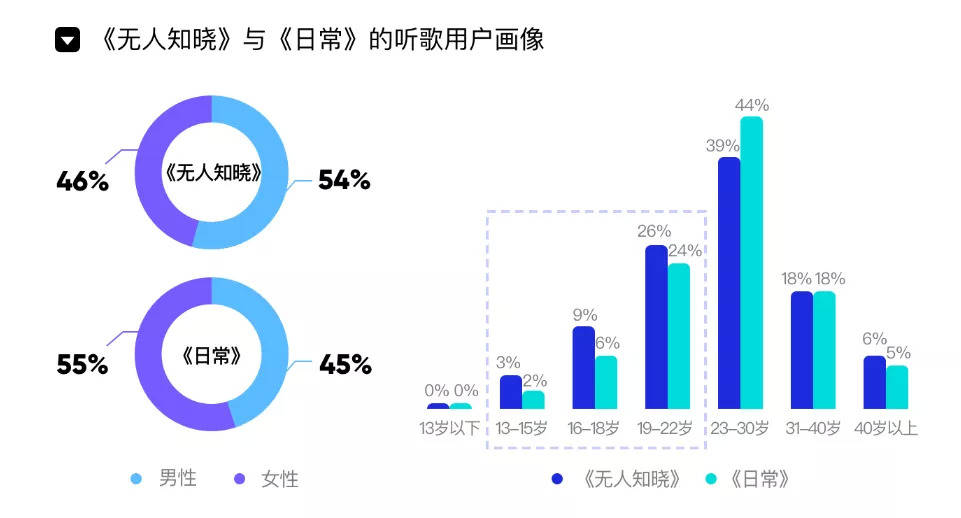 Q3《报告》中对三部“突破之作”进行了具体分析:田馥甄(Hebe)通过专辑《无人知晓》探索流行与独立音乐的结合。加入更多独立音乐内容后,田馥甄收获了更多男性听众及年轻听众关注。对比田馥甄前一张专辑《日常》,新专辑男性用户增加了9%,13-22岁的听众占比整体上升。