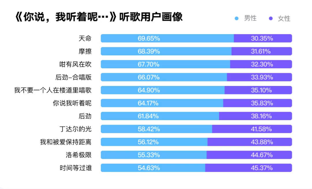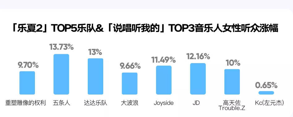 《报告》显示,以Q3两档头部音综《乐夏2》和《说唱听我的》为例,节目期间,除原本女性听众较多的Kc左元杰(《说唱听我的》参赛音乐人)外,其他音乐人女性听众均迎来较大涨幅,平均涨幅超过10%。今夏的大赢家五条人乐队,女粉涨幅高达13.73%。