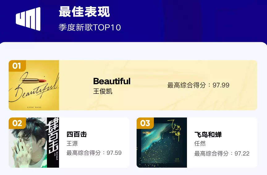 从由你音乐榜季度榜单的排名情况也不难发现,女性听众的偏好左右着上榜歌曲的排名。在Q3新歌TOP10榜单中,拥有庞大女性基本盘的“帝国三子”成绩抢眼。王俊凯的《Beautiful》位列TOP1,王源的《四百击》紧随其后,易烊千玺的《粉雾海》与《My Boo》则排在TOP4、TOP7两个位置。合体歌曲《和你在一起》作为TFBOYS在成军七周年之际向粉丝们寄出的一封情书,同样上榜,位列第六。