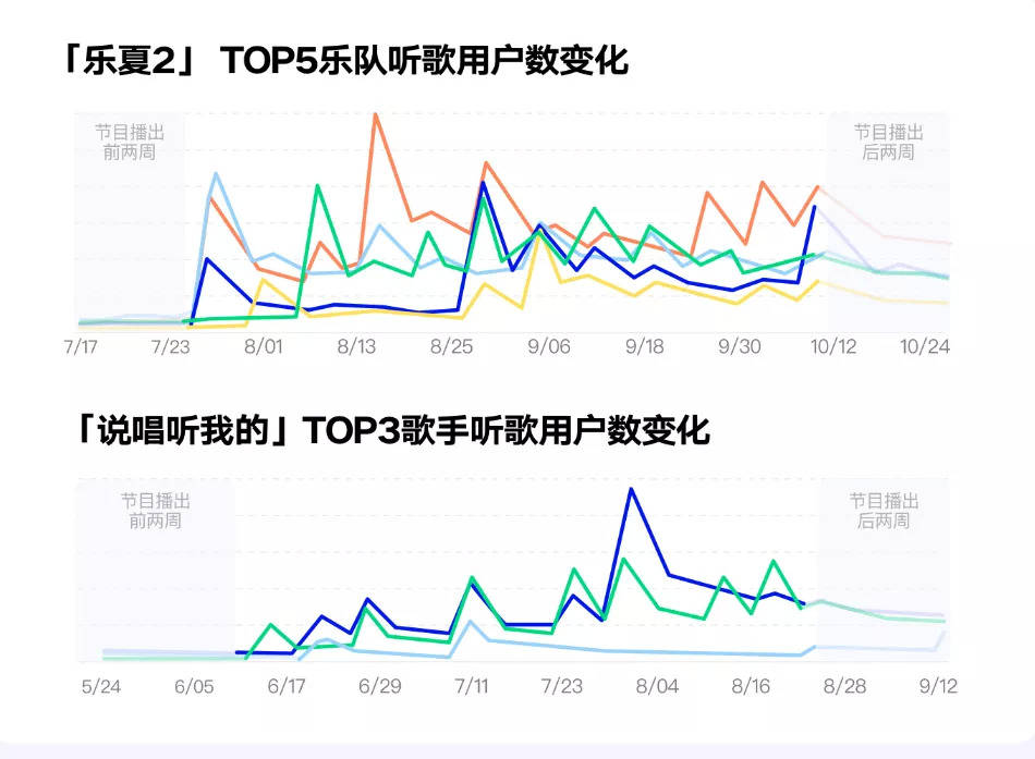 不论是Q2《报告》内盘点的偶像音综,还是Q3《报告》盘点的垂直音综,皆表明头部音综歌曲影响力广泛、拉动艺人热度明显。节目播出期间,排名较高的乐队与音乐人其听歌用户均暴涨。节目结束后,也有相当一部分用户留存,成为固定听众乃至忠实粉丝。