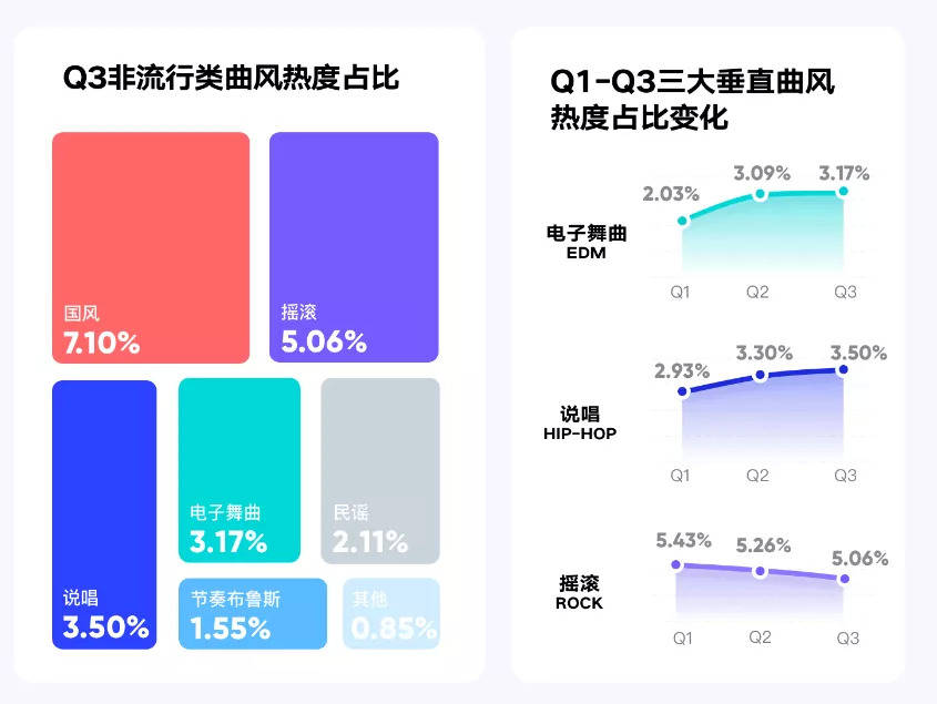 从非流行类曲风的占比看,国风的Top1位置稳固、电音与说唱稳步上升。这一占比再度印证了女性偏好与歌曲热度的正相关。