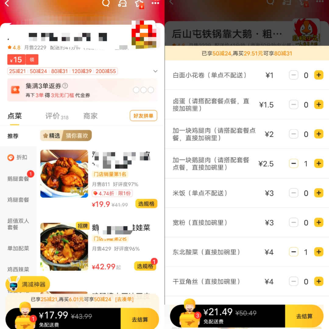 另外一点,则是商家会将全店主食商品的价格,设置到离满减优惠价差那么一点点的价位,例如满减的最低价是20元,而商家全店的主食最低价则在20元以下,比如19.99元,然后在配以用户并不需要的2元甚至5元的配菜或者饮料,让用户购买在进行满减,而且满减后的价格并不会低太多,反而有时会出现买后还高了几元的情形。