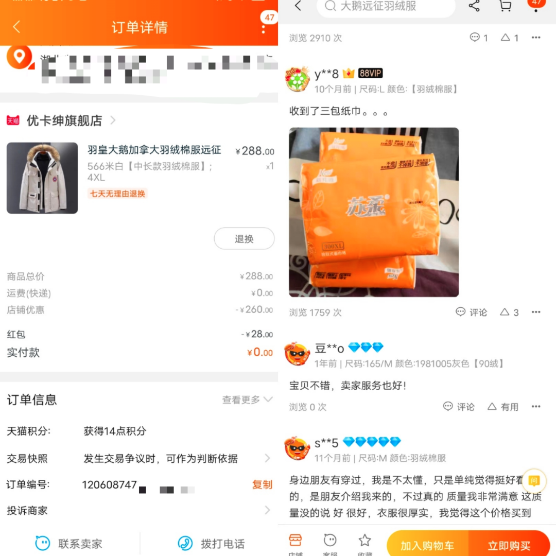 据某薅羊毛群里的一位网友介绍,当天,群里很多人都去领了一家名为“优卡绅旗舰店”的满减优惠券,用户下单后,原价288元的羽绒服,通过优惠券满减后,只需要0元即可购买,这件商品的月销量在当晚的短时间内达到了1000+。后来,店家停止了领券活动。当天领券购买的用户也在等待商家发货,毕竟他们也不相信商家真的一定会发货,抱着一种玩一玩的心态,毕竟没花一分钱。