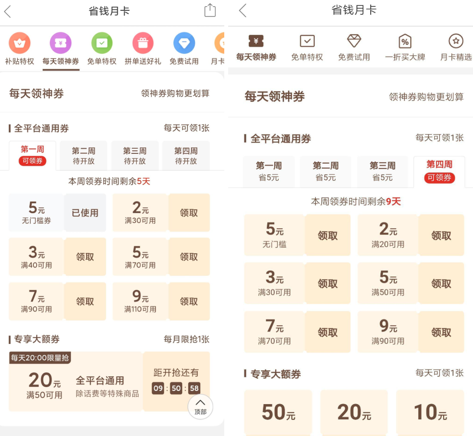 通过对下图的对比可以发现,重新开通拼多多月卡后,每周赠送的通用券相比于首次开通月卡获赠的通用券,在使用门槛上普遍高了10-20元。