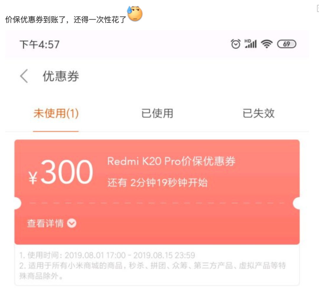 一位在去年8月份,在小米商城买了手机的用户,通过平台保价服务,获得了一张300元的优惠券,该用户觉得这种这优惠券有点鸡肋,自己要兑换赔偿还要继续买东西。