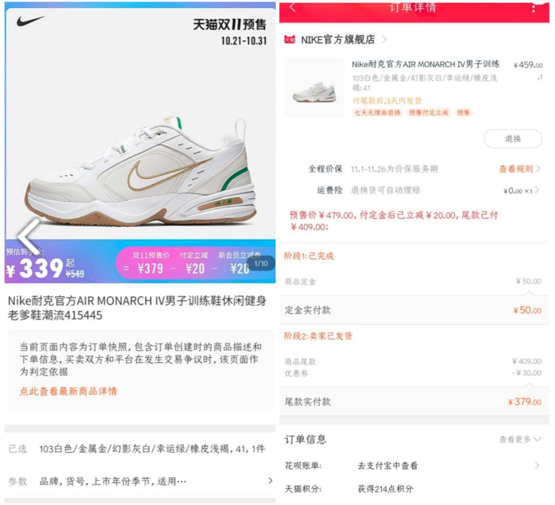据悉,该用户在双十一活动中参与了耐克官方旗舰店的预售活动,购买一双运动鞋,但发现在交付尾款时,实际支付价格相比商品详情页显示的预付定金贵了一百元。
