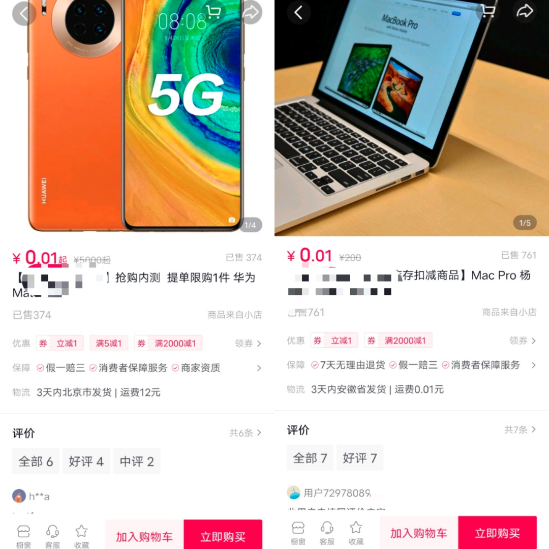 京东、抖音等平台上就存在这样“0元购”的套路现象。以抖音为例,一家抖音上的小店,将原本价值数千元的华为手机和苹果电脑的价格设置成0.01元,以此为噱头,吸引用户进行购买。根据该小店的销售数据显示,两件商品的销售量均在300以上,并且两件商品的评价都是中评以上,没有差评,知情人士透露,这是小店商家招人刷的评论,引诱一些贪小便宜的用户进行购买,购买后发空包裹或者廉价的其他商品,以此进行刷单,基本各个平台都有这样的套路商家,目的只有一个,通过好的评论和低价吸引用户上钩,将自己店铺的销量数据提升。