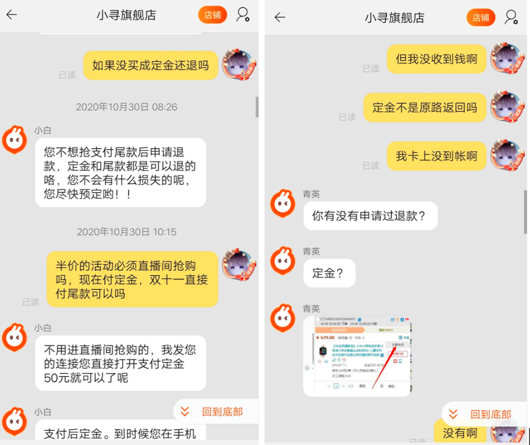 一位用户表示,今年的双十一本来要买小寻电话手表,但该手表需要预售才能优惠获得,于是咨询了客服,客服说先预付50元,即可参与双11零点三十抢前二百名半价活动,保险起见,他还在问当时问客服,买不上定金可以退吗?客服说可以。但过了几天后,店家在其不知情的情况下,关闭该笔交易,尾款也付不了,定金也没了。再咨询客服,客服表示是交易关闭,并没收自己的定金,活动也改成1分钱抢购前一百名半价活动。